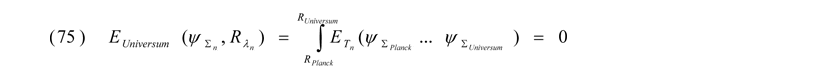 3. Als Ergebnis dieser Betrachtungen sollen somit aus dem Vakuum heraus in den jeweiligen Potentialtöpfen ständig Energiefelder für zugehörige Elementarteilchen erzeugt werden, welche im nicht gestörten Zustand Funktionen stehender Wellen mit ganz spezifischen Schwingungsmustern und damit Energien und -zuständen entsprechen. Die Aufsummierungen bzw. Kombinationen der positiven und negativen Energieanteile ET,n aller Wellenfunktionen ψΣ,n in den betreffenden Potentialskalen Rλ,n im gesamten Universum ergeben gleich Null.
